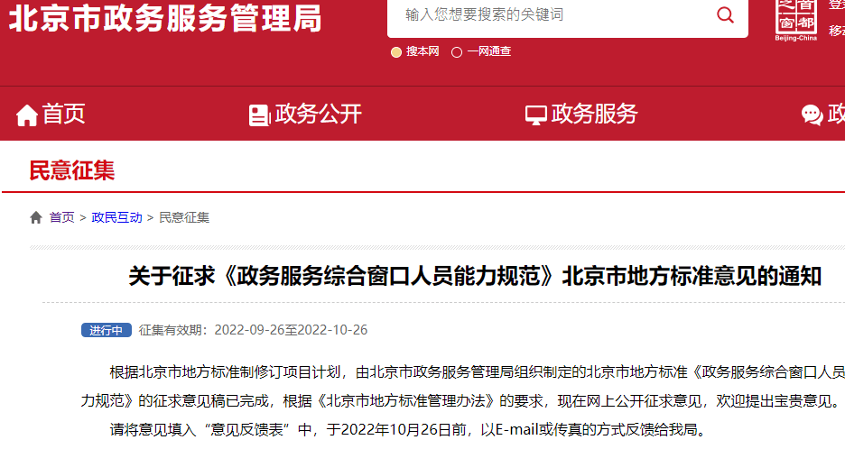 中國北京市近日針對《政務服務綜合窗口人員能力規範》,公開於網路上徵求意見,後續將意見整理成稿件依規定在網路公開並再次尋求意見,內容包含對窗口人員的服務禮儀、服務流程、監督考核等能力提出相應要求,並明列禁止窗口人員說出「我不是說過了嗎」等語,還有接遞文件資料禁止出現「丟、扔、拋、甩」等動作,種種規範引起網友熱議,還有人建議可以在全國實行。