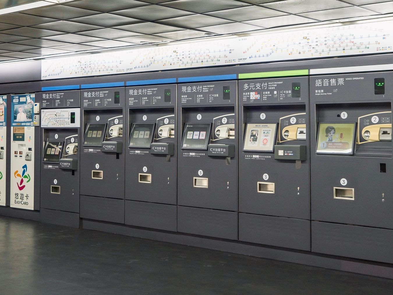 售票機台介面則以色調將畫面統合,以深灰色為背景突顯按鍵,同時賦予顏色不同意義,例如:金額相關訊息使用黃色、機台設備狀態使用綠色、往下進程的步驟使用藍色、取消及返回則使用紅色;此外在首頁就提供各國語言選項做資訊分流。