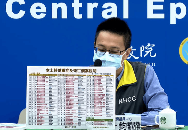 指揮中心指出,今日新增84例本土病例死亡個案,為47例男性、37例女性,年齡介於20多歲至90多歲以上,皆屬重度感染且具慢性病史、48例未接種3劑以上COVID-19疫苗。確診日介於今(2022)年9月19日至10月24日,死亡日期介於10月3日至10月24日。