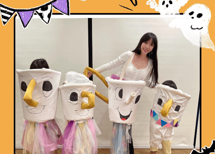 時隔10個月,李靚蕾終於在IG發文,原來是因為10月底萬聖節到來,李靚蕾親自動手DIY萬聖節變裝道具,她將塑膠籃底部挖空,套上白色、黃色、彩色等布料,再畫上五官及裝上多彩紗布裝飾,孩子們穿上茶杯成品,變身成動畫《美女與野獸》的「阿奇」,而李靚蕾將自己裝扮成「茶壺太太」。