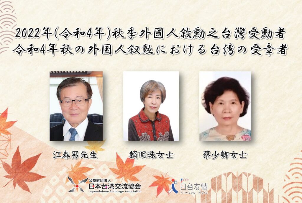 日本政府今(3日)公布2022年(令和4年)秋季外國人敘勳的受勳者名單,3位促進台日友好的台灣人獲此殊榮,包括中華文化總會副會長江春男、翻譯家賴明珠與日台交流協會在地職員蔡少卿。