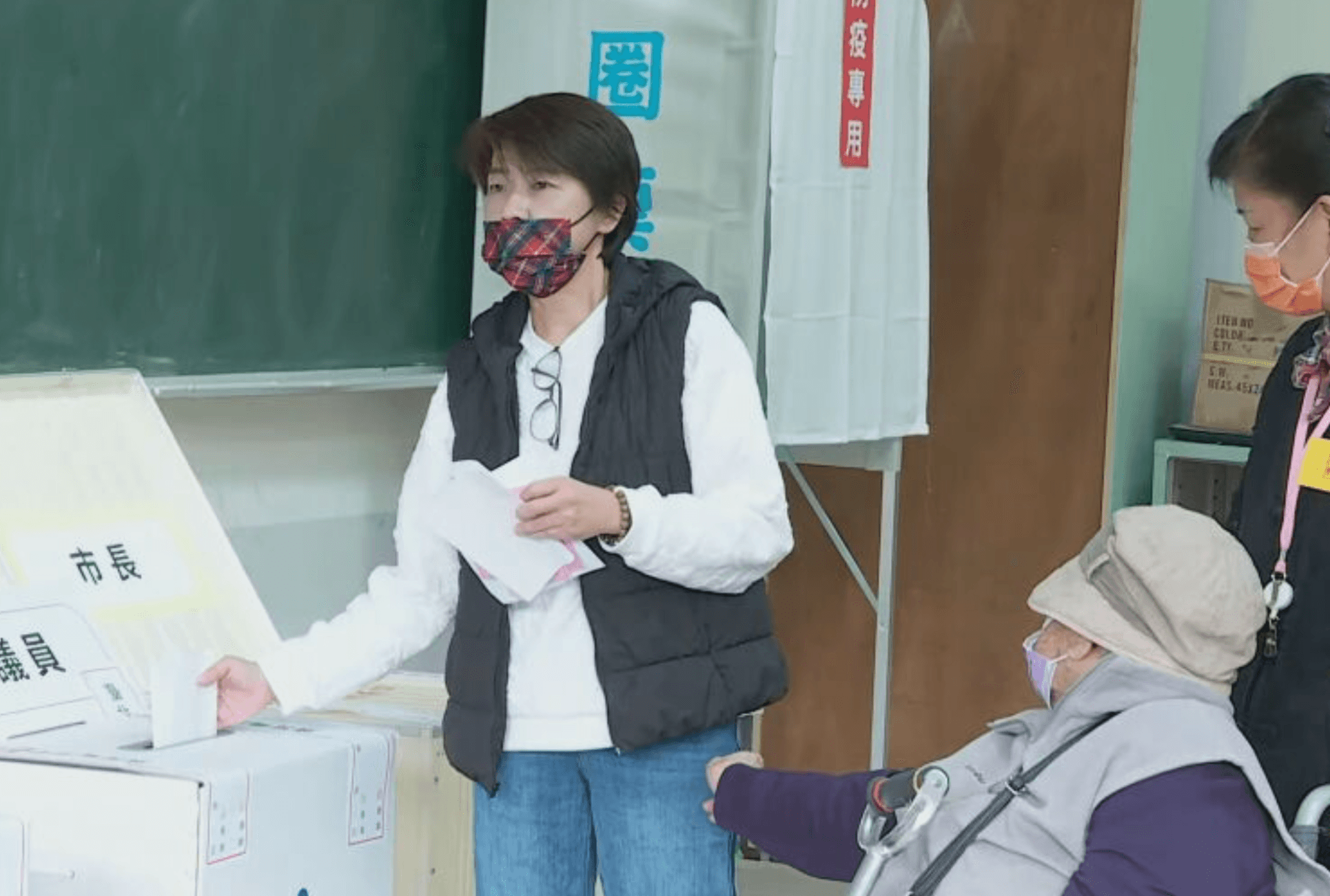 而黃珊珊在上午10時許,推著坐在輪椅上、高齡93歲的母親現身投開票所,她也是「北市三強」中最晚出門投票的,國民黨候選人蔣萬安於9時許完成投票、民進黨候選人陳時中則是8點多就投完票。