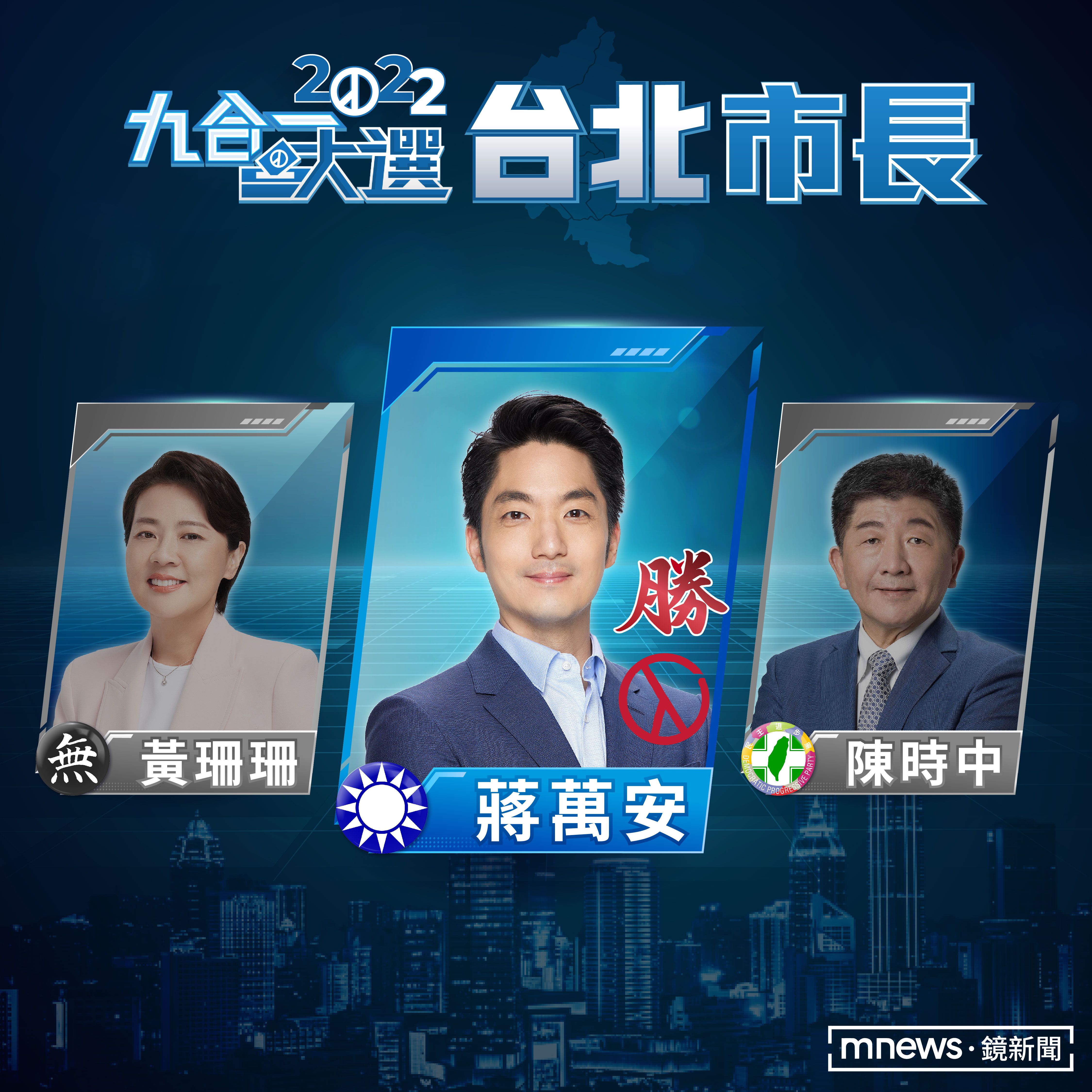 九合一選舉26日投票,台北「三腳督」戰況激烈,蔣萬安晚間自行宣布當選,他也是史上最年輕台北市長;他稱讚陳時中及黃珊珊是可敬的對手,也謝謝所有的支持者,最後當選結果以中選會公告為準。