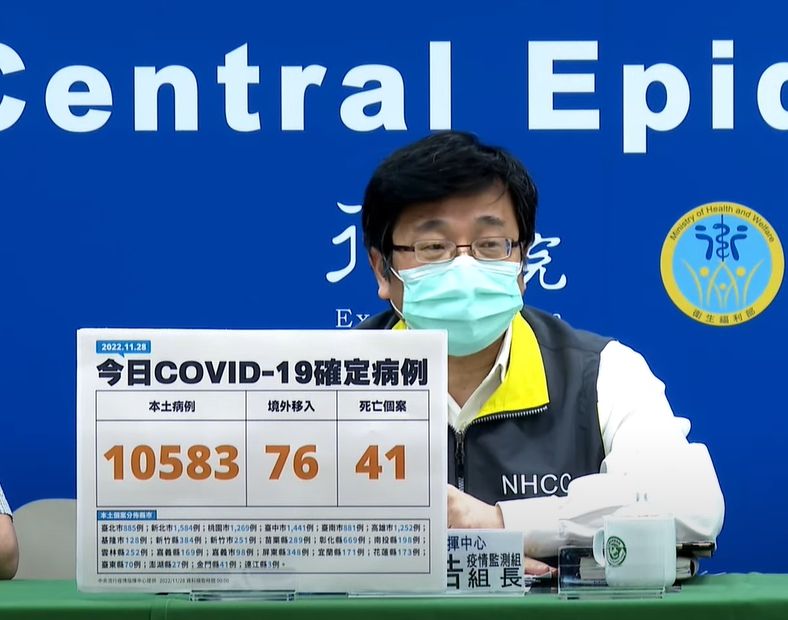 指揮中心指出,今日新增41例本土病例死亡個案,為19例男性、22例女性,年齡介於30多歲至90多歲以上,皆屬重度感染、36例具慢性病史、28例未接種3劑以上COVID-19疫苗。確診日介於今(2022)年5月4日至11月24日,死亡日期介於5月4日至11月25日。
