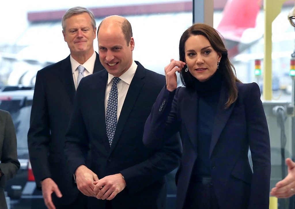 威廉王子與凱特王妃於11月30日飛抵到美國波士頓機場,將進行為期3日的訪問,凱特下飛機時以深藍色西裝外套、搭配率性的褲裝登場,並精心戴上藍寶石耳環,以深藍色衣著配上耀眼的藍寶石,被認為是在向已故的黛妃致敬。