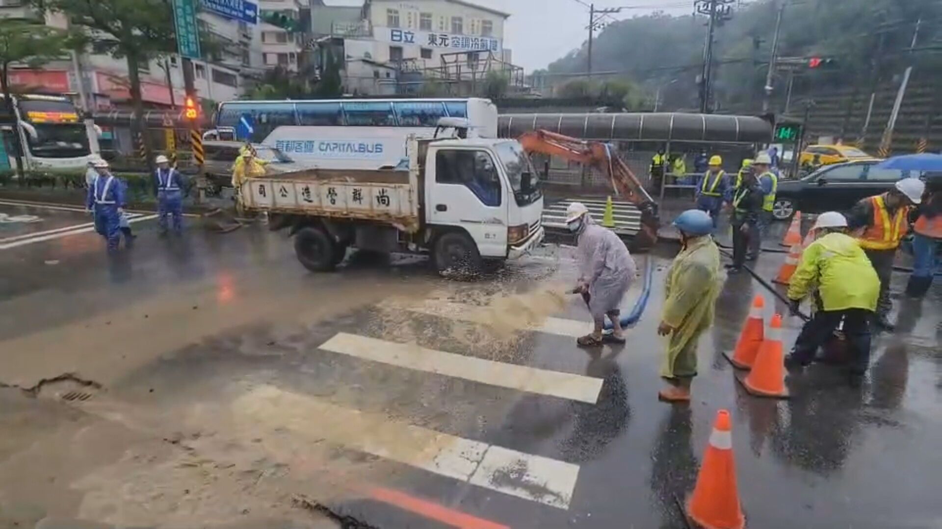 工程人員挖開地面,發現自來水爆管,泥水漫到路面,全是因為自來水爆管,壓力過大,造成路面攏起,出現高低差。基隆市警察局第四分局大武崙派出所在凌晨4點20分接獲通報,立即實施車道封閉管制,緊急調撥萬里往市區方向的車道雙向通行,並且即時通報自來水公司到場搶修,預計要到晚上才能修復。