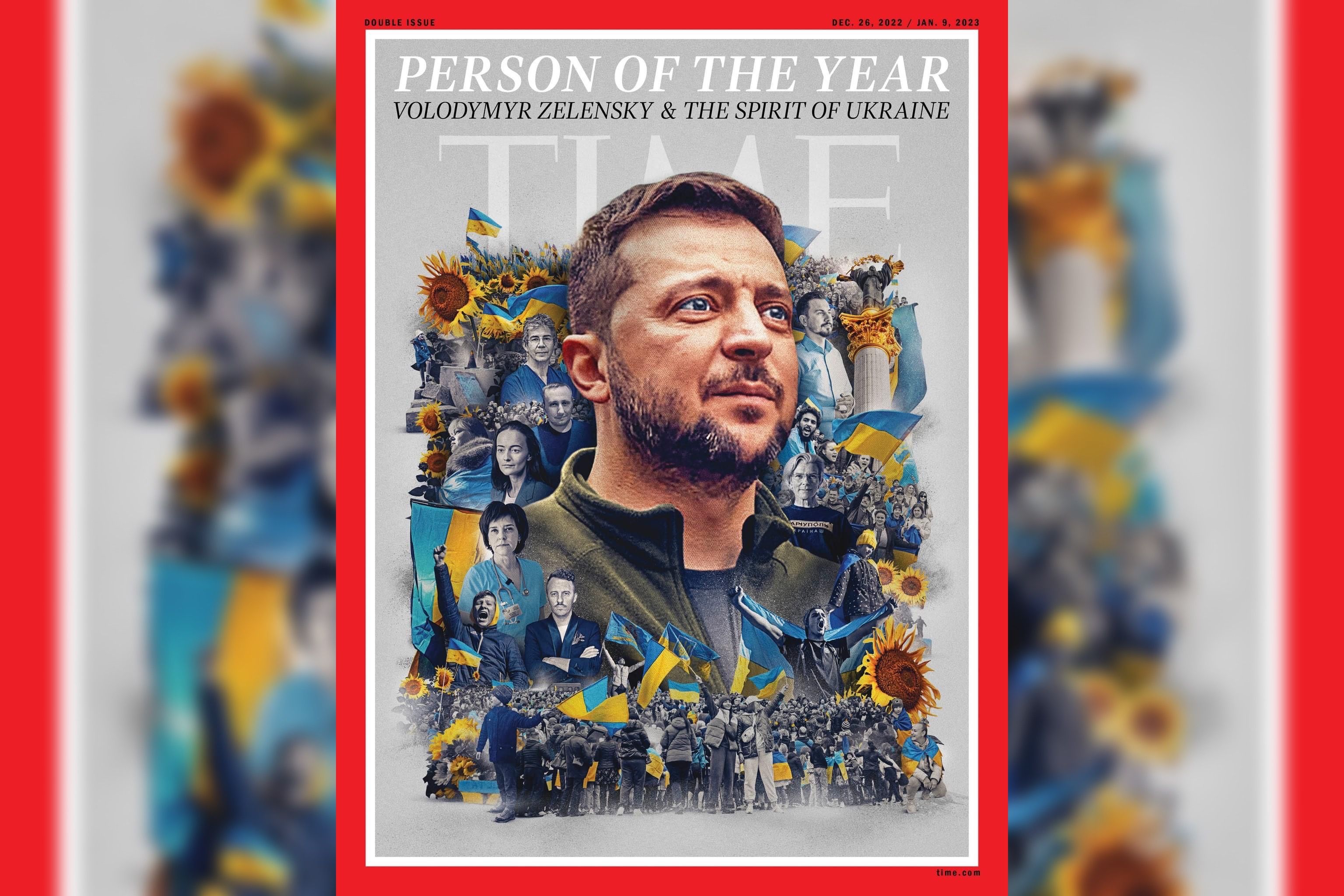 《時代雜誌》公布的年度風雲人物封面,正中央的澤倫斯基身穿標誌性的軍綠迷彩服、而不是西裝,他的身邊圍繞著數十人,有人手舉烏國國旗,代表烏克蘭精神,其中描繪了在砲襲期間接生無數嬰兒的婦產科主任康德拉托娃(Iryna Kondratova),號召同業、免費提供羅宋湯給災民的基輔廚師克洛波堅科(Ievgen Klopotenko),以及冒死前進第一線的《基輔獨立報》主編魯丹科(Olga Rudenko)等人。