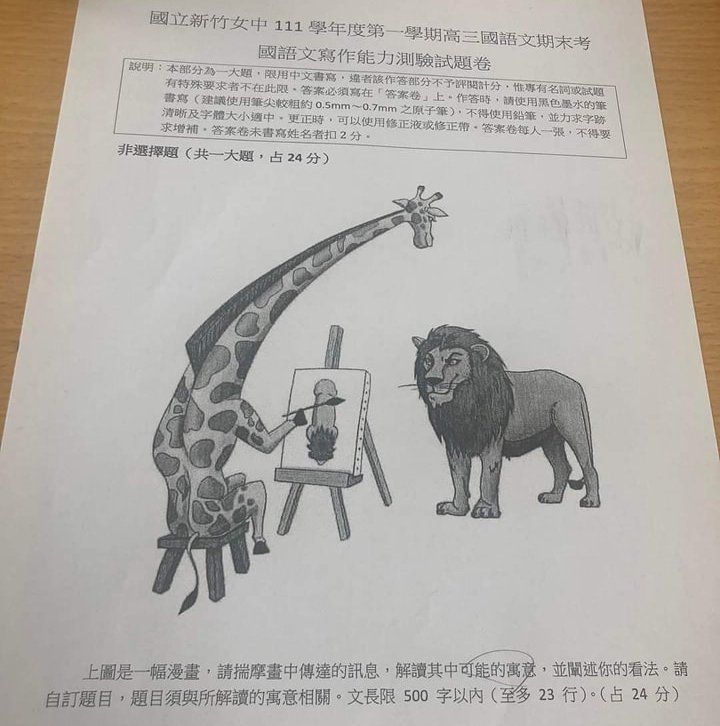 新竹女中這份國文期末考試卷,其中非選擇題一大題占24分,附上長頸鹿在幫獅子作畫的圖片,要求學生「揣摩畫中傳達的訊息,解讀其中可能的寓意並闡述看法」,由於長頸鹿視野較高,以至於只能看到獅子帶有鬃毛的頭頂和背部,而長頸鹿畫出的成品,讓不少網友發揮聯想力,連「巴毛律師」陳宇安都表示「新竹女中我真的是栓Q(指無言或對某件事很討厭的情緒)了」。
