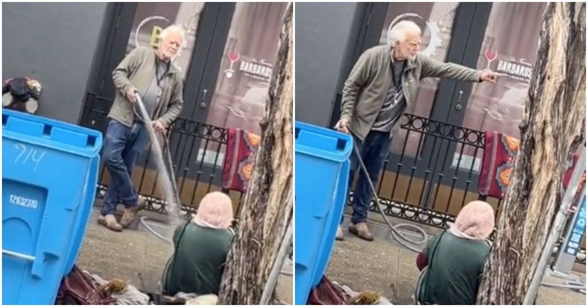 綜合外媒報導,當地時間9日,舊金山金融區的精華地段,有一位咖啡廳員工在外送的路上,看到畫廊老闆拿水管,不斷對著蹲坐在一邊的女街友噴水,這名員工立即拿起手機拍下整個過程,老闆全程表情不屑,就算女街友一直求饒說「不要!我會離開!」老闆依然持續噴水。