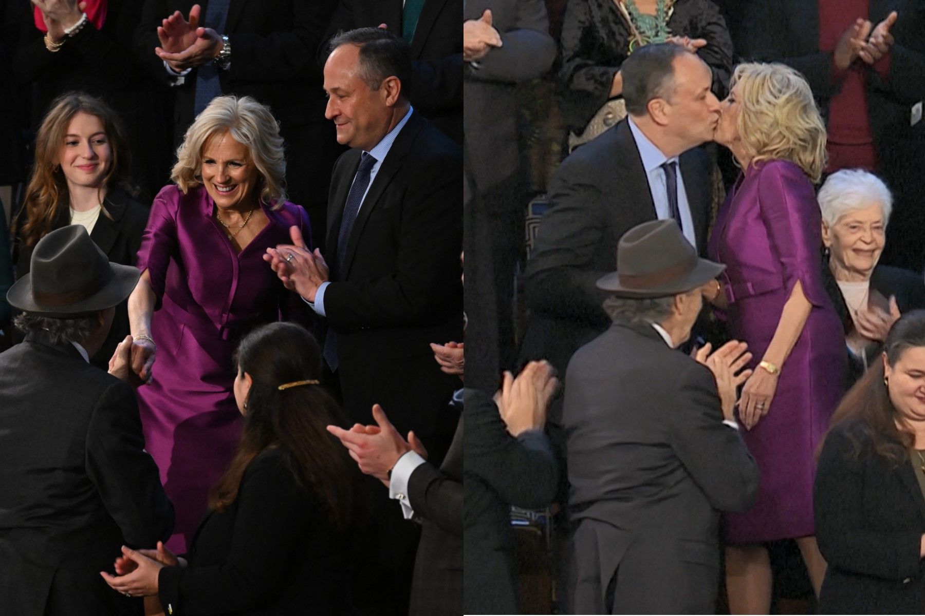 在拜登發表國情咨文演講前,美國政壇重要人士陸續抵達國會山莊,美國第一夫人吉兒拜登,以及美國第二先生、賀錦麗的丈夫任德龍(Douglas Emhoff)也未缺席,兩人的位置被安排在一起,前面則是前眾議院議長裴洛西的老公保羅,吉兒拜登在全場的歡呼及掌聲中登場,一邊打招呼,一邊艱澀地走進擁擠的人群,在要經過任德龍時,兩人先是握手,接著任德龍下巴前傾,吉兒拜登則順勢親吻致意,然後繼續往前走,現場的歡樂氣氛並未因此改變。