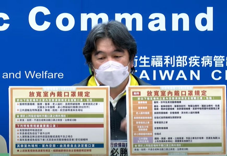 中央流行疫情指揮中心今(9日)公布自2月20日起實施室內口罩放寬政策,除了「醫療機構、醫事機構、老人福利機構、長照機構、榮譽國民之家、兒童及少年服務機構、身障服務機構、公共運輸及特定運具」仍須戴口罩之外,其餘室內場所由民眾自主決定是否戴口罩。各級學校等場域,開學後若疫情穩定,自3月6日起,校園及托育場所室內可不戴口罩。