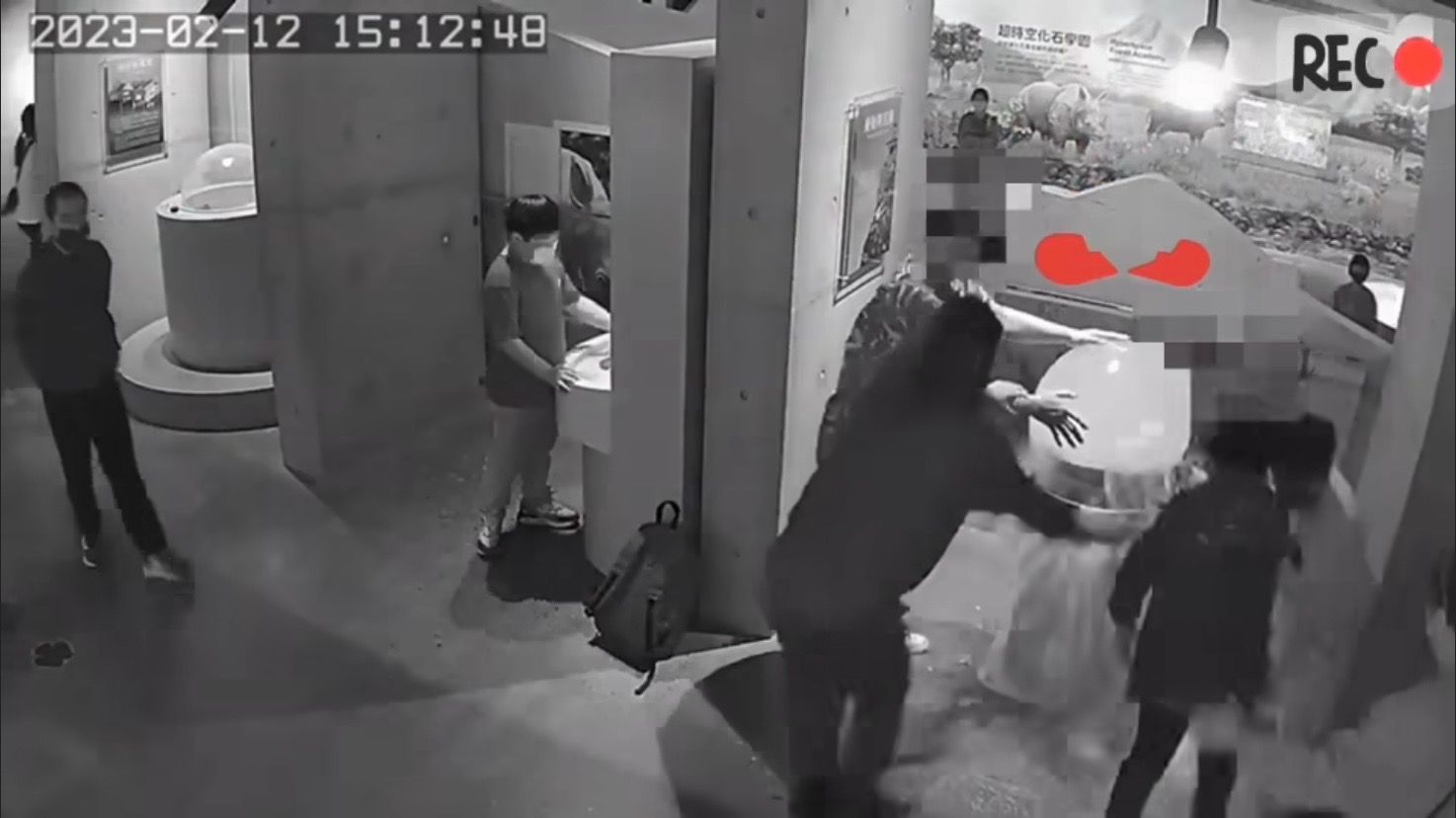 從畫面中可以發現,一位小朋友原先正常地滑動球體水缸下方的機關,體驗、觀察著球體內部化石擾動、沉積的情形,這時一位身穿花襯衫的中年男子上前,雙手捧住水缸開始左右搖晃,接著身旁的兒童也加入一起搖,後頭的中年婦人見狀後雖連忙出手制止,不過為時已晚。霎時水缸受力過猛破裂,落至地面後破成了兩半,大量液體流瀉而下也將展區地面弄地一片狼藉。