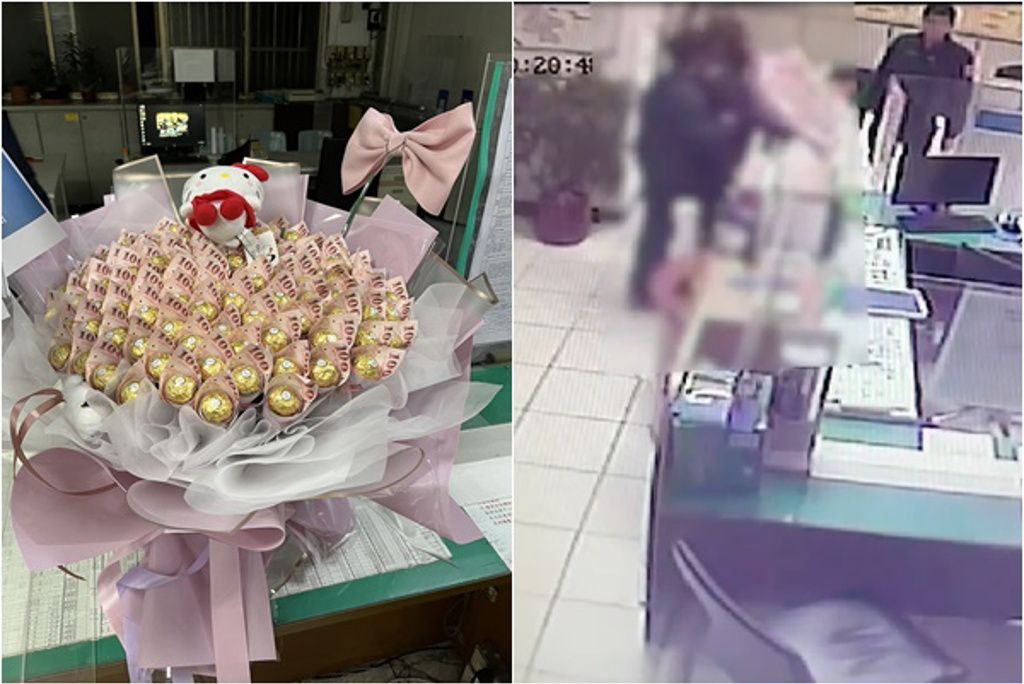 昨天是西洋情人節,不少人相約度過浪漫節日,不過民眾在新北市國小附近發現一束以百元鈔票點綴的金莎巧克力花束,上方還點綴一隻「Hello Kitty」玩偶遺落,送至派出所招領,今(15日)上午7時出現一名男子神情落寞出面認領,不願多提遺失原因,經確認遺失物內容及遺失地點無誤已領回。