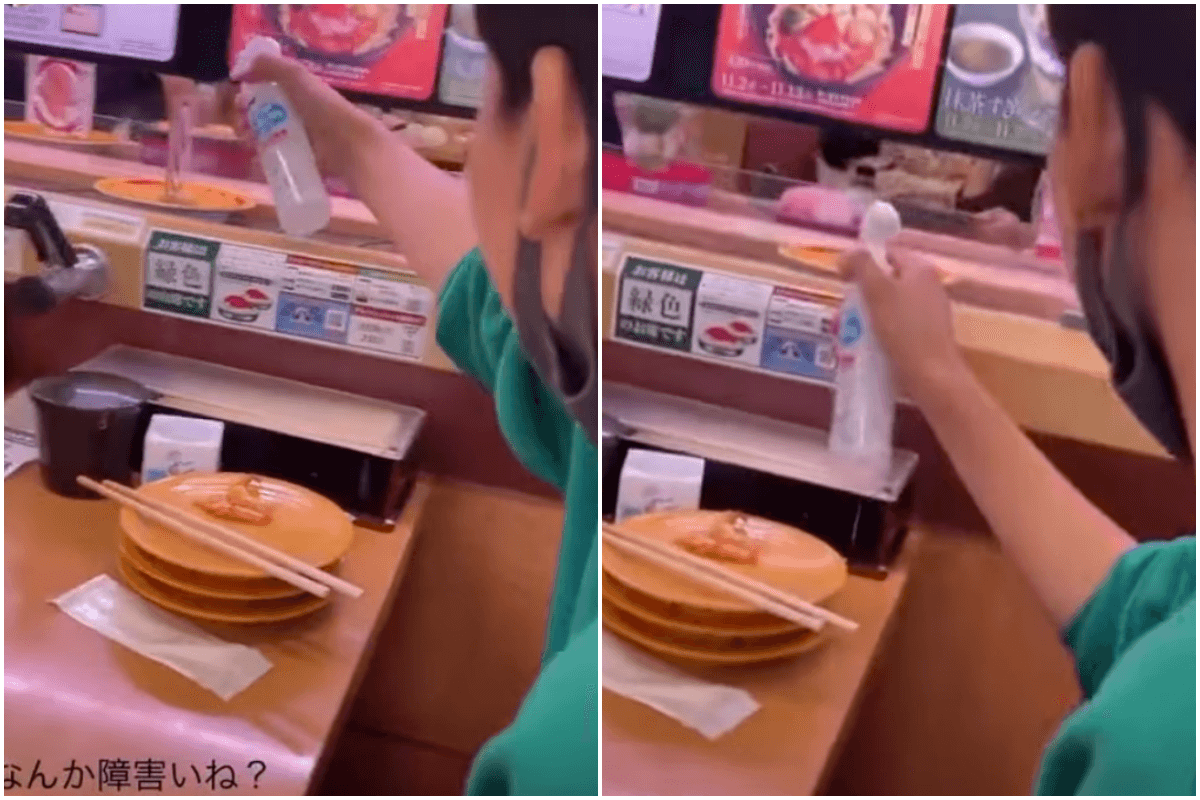 日本迴轉壽司業者「壽司郎」日前陷入食安風波,有青少年舔店內公用醬油瓶、將口水抹在壽司上,導致壽司郎母公司股價大跌、形象連帶受損,未料近日又傳出有青少年在壽司郎鬧事!一名男高中生拿著酒精對迴轉台上的壽司狂噴,影片曝光後引起網友撻伐。