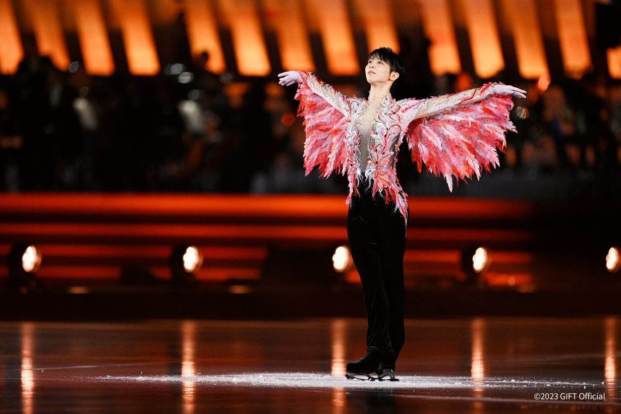 羽生結弦雖然在北京冬奧無緣三連霸,但轉體「4周半跳」獲得國際滑冰總會認證,成為花滑史上第一人;公演《GIFT》他以浴火重生的鳳凰做為重新出發的象徵,前半部分的壓軸更使用北京冬奧的曲目《引子與迴旋隨想曲》,寄寓不斷挑戰抓住夢想的意涵,共演出12首曲目,盡顯花滑王子冰上翩翩起舞的風采。