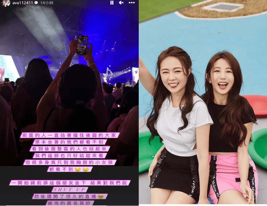 南韓人氣女團BLACKPINK旋風來台,在高雄世運主場館連唱2天,吸引萬人朝聖,而藝人丫頭(詹子晴)相約好友郭書瑤18日開心去聽演唱會,無奈卻被前方站起來的歌迷擋住視線,她們好言相勸卻反遭嗆聲,兩人接連在IG發限時動態表示自己被兇的莫名其妙。