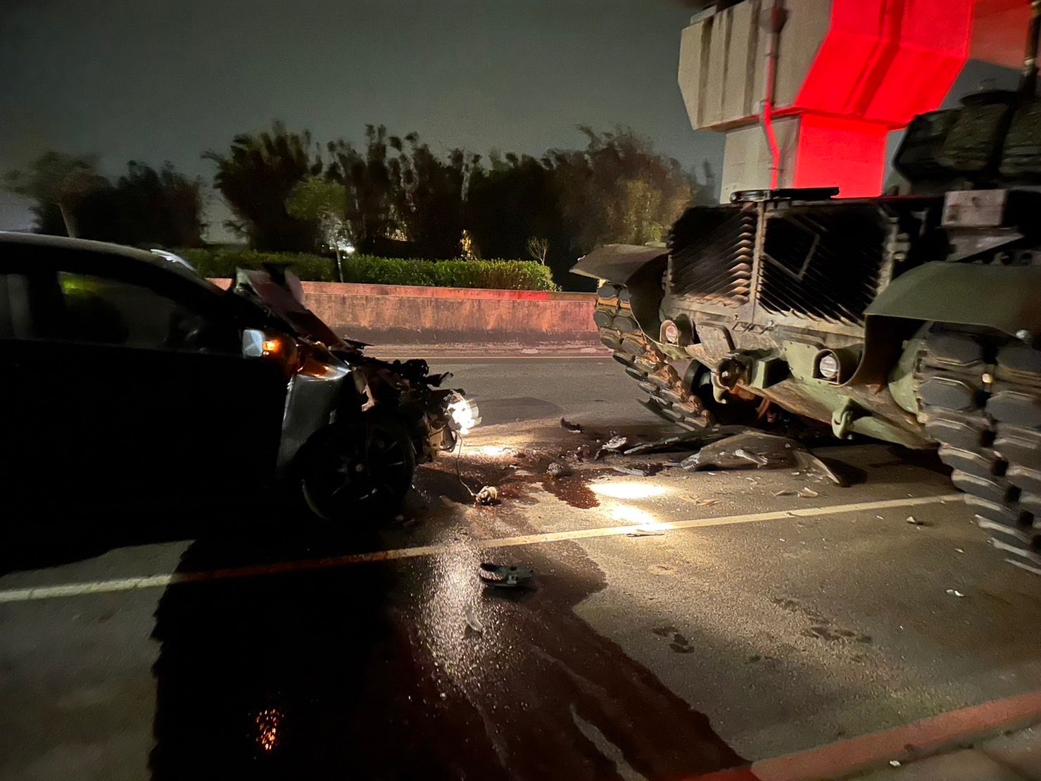 陸軍第六軍團542旅20日晚間執行夜間演訓任務時,一輛CM11戰車於台31線、桃園楊梅高鐵南路附近遭到一輛自小客車追撞,後者車頭和擋風玻璃全毀,疑是自小客車駕駛恍神。對此,六軍團指出,事發當下隨即將民眾送醫治療,目前全案正由警方釐清肇責中。