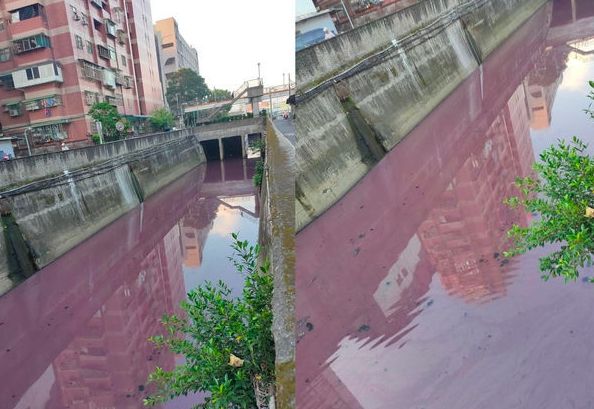 新北市新莊區美式賣場周遭上月才傳出不明臭味,源頭至今未查明,今(23日)有網友發現,相距不到10分鐘車程的光華國小旁,名為「潭底溝」的大排水溝,水色竟然從深黑轉為粉紅色,痛批過去砸大錢的下水道白做了。對此,新北市環保局回應,到場勘察時,水面已恢復原色,將追溯排放源頭。