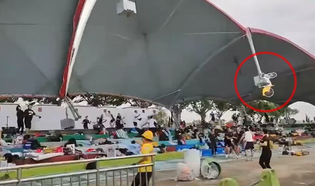 全台今(23日)約下午2點颳起強陣風,台北地區由於盆地地形風勢更顯強勁,原民會在大佳河濱公園舉辦活動,現場大型工作帳篷被強風吹翻,現場一台YouBike被帳篷勾到,竟也遭瞬間風力勾起又重重落下,一名女性被倒塌的帳篷壓傷,所幸並無大礙。