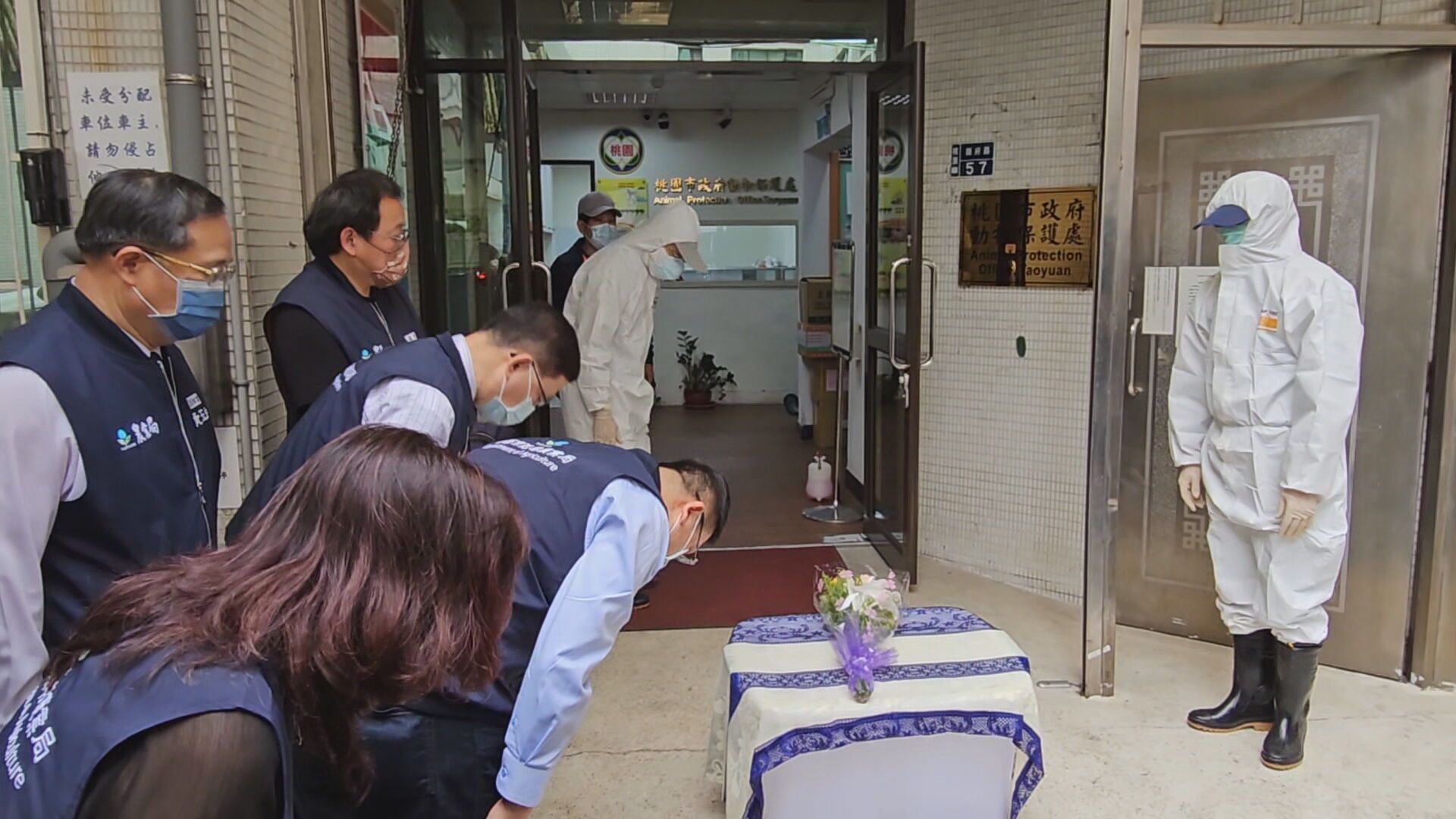 東非狒狒27日在圍捕過程遭到獵槍射殺,今(28日)遺體送往台北市立動物園勘驗,而上午遺體從桃園市農業局要運往動物園前,農業局人員為在放置狒狒遺體的箱子上蓋上一塊布,並放上一束鮮花,為牠鞠躬送行,但也有網友看到畫面後大感不滿,直批「作秀」。對此,寵物殯葬業者表示,看不太出來是什麼布,不過一般台灣習俗會蓋上往生被。
