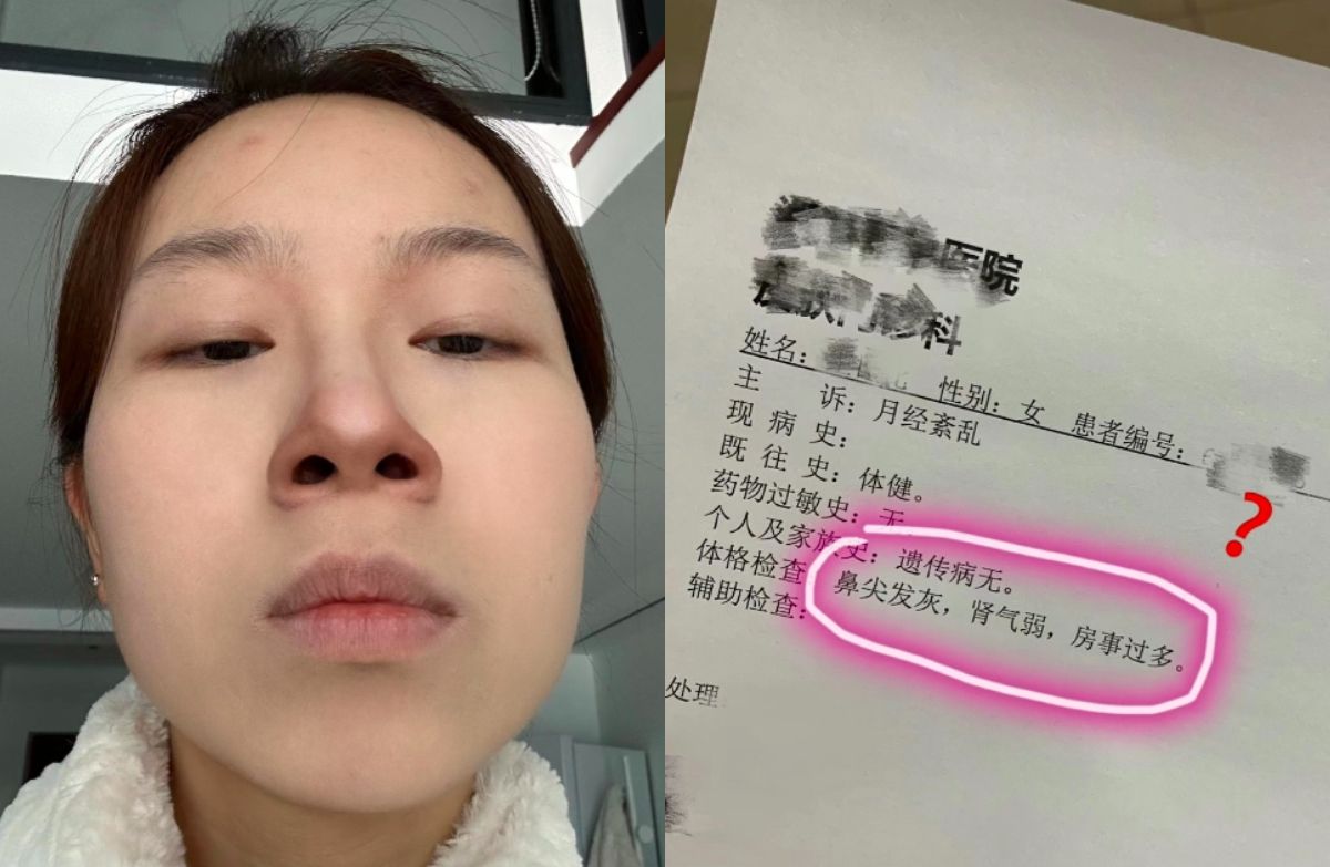 中國一名女網友,日前因為生理痘到中醫求診,醫生仔細端詳她的臉後,在診斷書開下「鼻尖發灰,腎氣弱,房事過多」,讓一同陪診的女網友母親叮嚀「年輕人不可以太過放縱」,女網友看得一頭霧水,最後才發現原來是「鼻影」出了問題。