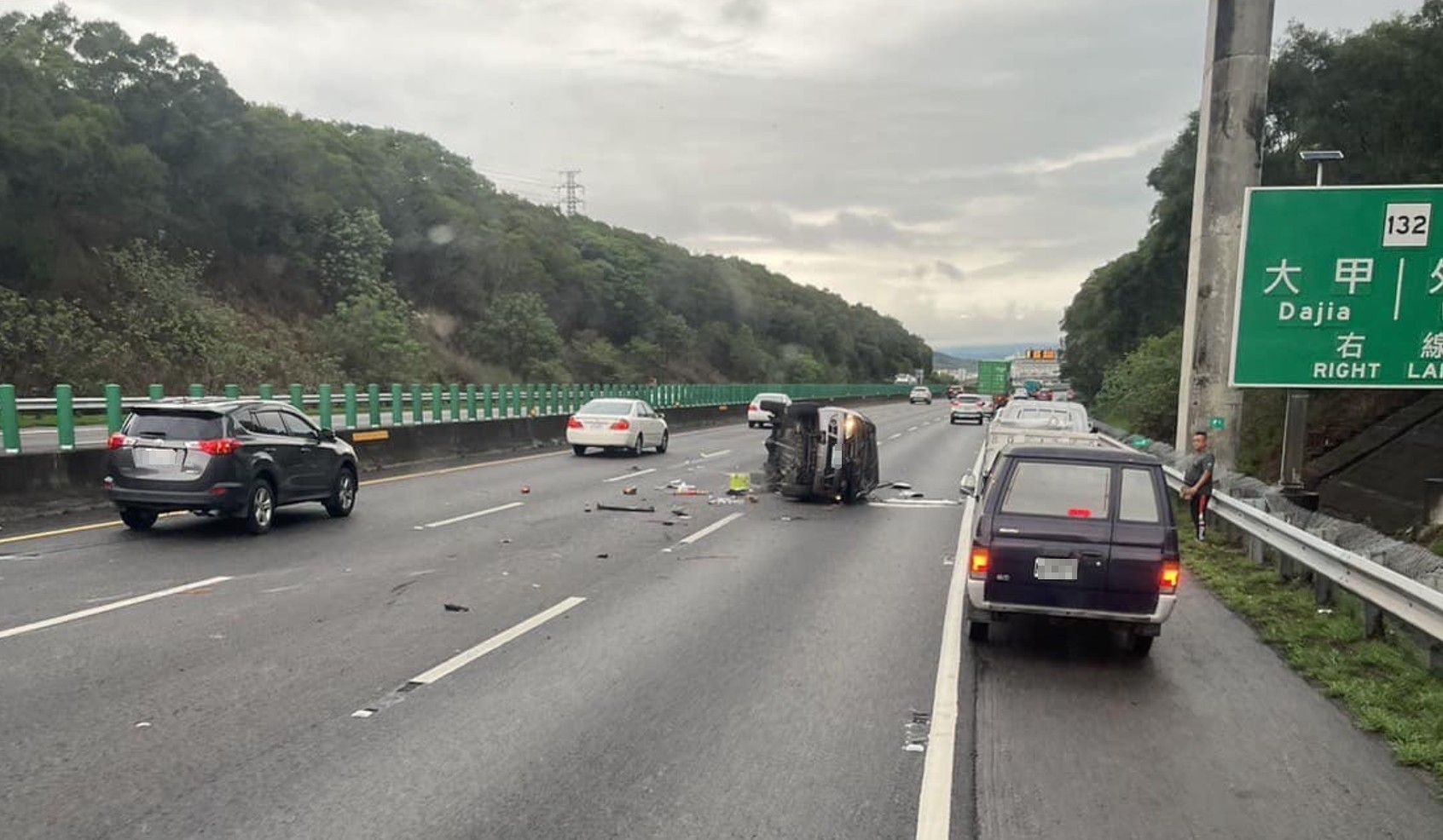 由於正值交通尖峰時段,員警立即指揮交通並排除事故現場,至於翻覆的自小客車駕駛經救護車送往大甲光田醫院後檢傷,意識清楚沒有大礙。55歲的駕駛董男稱,行經該路段時,發現前方好像有個「人」倒臥在內線車道,嚇得他趕緊閃避,結果不慎卻翻覆。