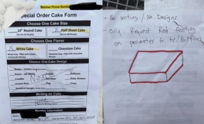 美國一名網友在論壇Reddit分享,自己向好市多訂製了一個蛋糕,由於害怕溝通上產生誤解,這名網友相當仔細的在表單上寫下自己的需求,還畫出示意圖,深怕工作人員看不懂,不過成品出爐卻讓他傻眼了。