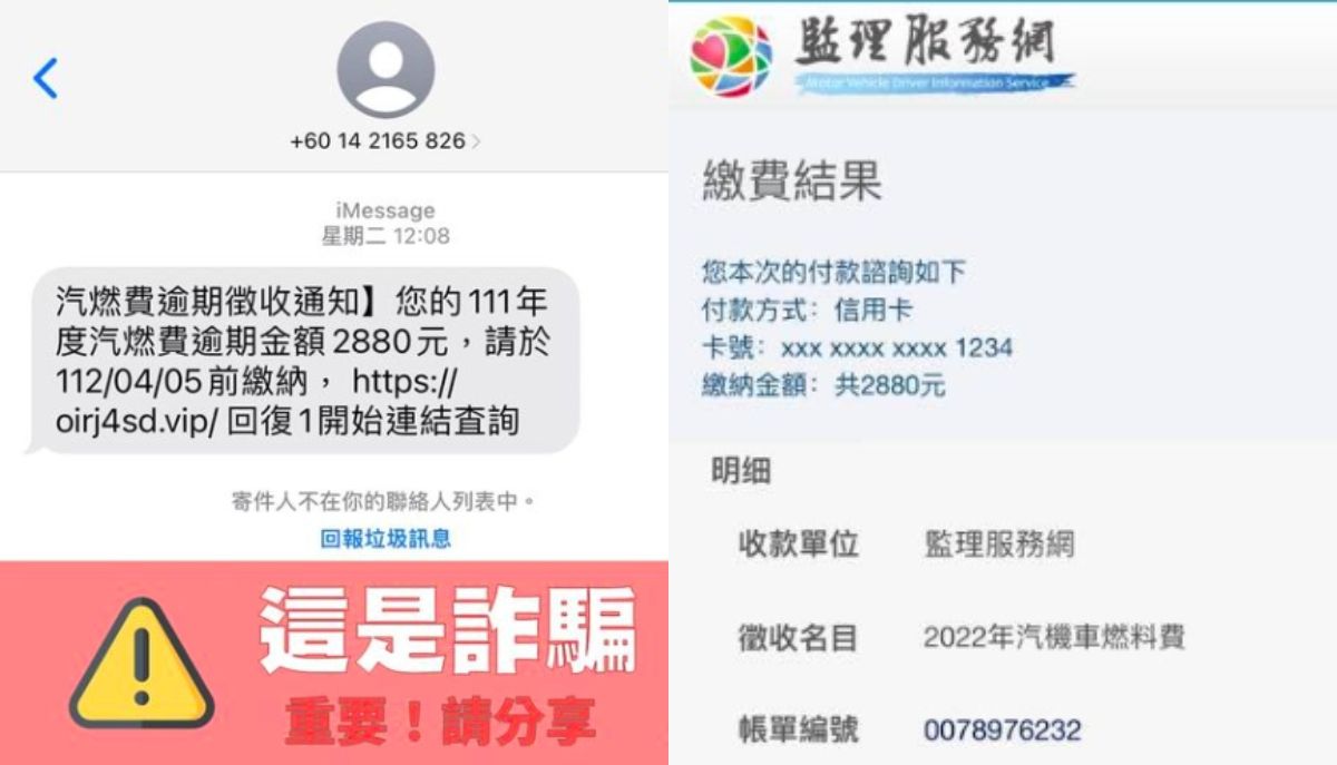 詐騙猖狂、手法推陳出新,有不少網友發現,6,000元普發現金才剛入袋,馬上就收到「汽燃費逾期通知」詐騙簡訊,金額都固定為「2880元」,且簡訊上附有一串以「.vip/」結尾的假網址,點選連結過去後,將會出現假的「監理服務網」,以假亂真的手法,讓民眾稍有不察就上當。