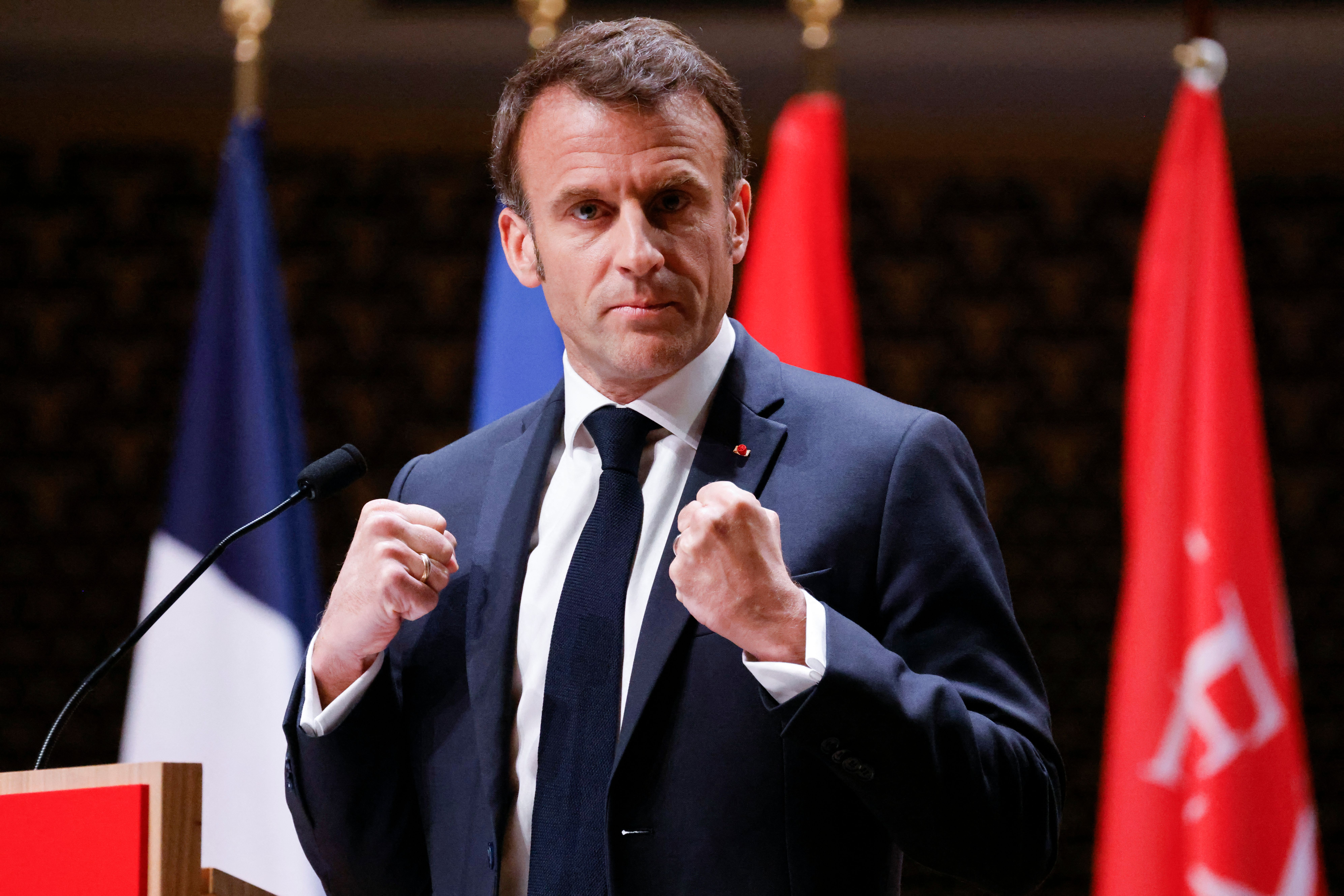 根據《法新社》報導,馬克宏(Emmanuel Macron)在訪中行程中的台海言論,引發爭議,他在當地時間11日下午到荷蘭海牙,以安全與經濟事務上的「歐洲主權」進行演講,途中抗議民眾打斷馬克宏演講,高喊:「法國的民主在哪裡?我們什麼時候失去了民主?」馬克宏則回應,「如果你們給我一點時間,我可以回答這個問題。」