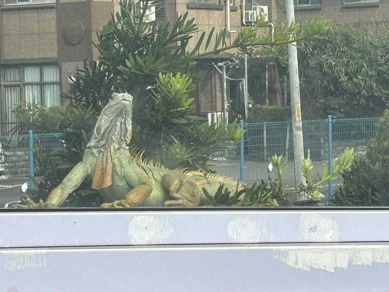 巨型綠鬣蜥在本月14日於新北市環快永和區保生路匝道現蹤,懶洋洋的牠貌似在做日光浴,而有名網友經過後拍下照片,發到社團上呼籲附近居民小心,不過怎麼感覺畫面比例怪怪的,照片裡的綠鬣蜥超級巨大,牠的體型是機車的兩倍,甚至比旁邊那排柵欄還高,這讓網友以為是不是錯棚,誤闖「侏儸紀公園」。