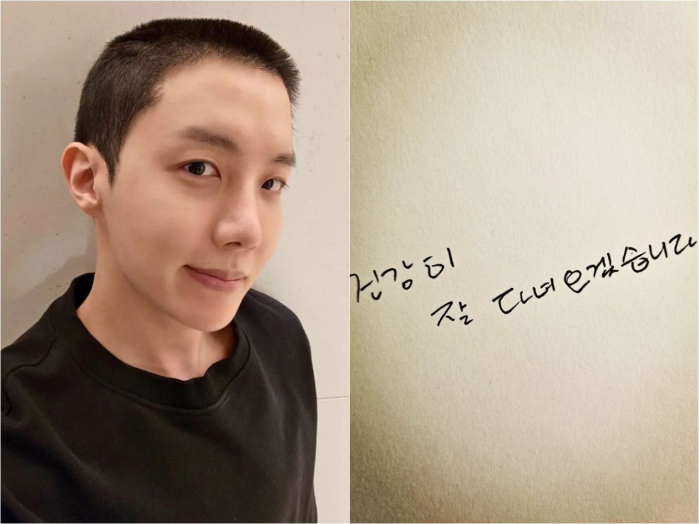 昨(17日)晚上J-hope在IG曬出自己的平頭照和給粉絲們的手寫信,表示自己會「健康的快去快回!」,也在跟粉絲的交流平台Weverse上和ARMY(BTS粉絲名)喊話,「我愛你們,ARMY,會好好地快去快回的!」,讓粉絲們都相當感動、不捨,貼文一出則超過七百多萬名粉絲按讚。