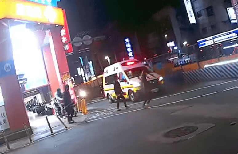 目擊網友在臉書爆料公社貼出行車紀錄器,畫面顯示,22日晚間18時57分許,一輛鳴笛救護車行經北市萬大路、東園街交叉口時,在路口減速停下,路邊2名行人見狀小跑步過馬路,另名行人也趕緊跟上,等路口清空後,救護車才繼續行駛。