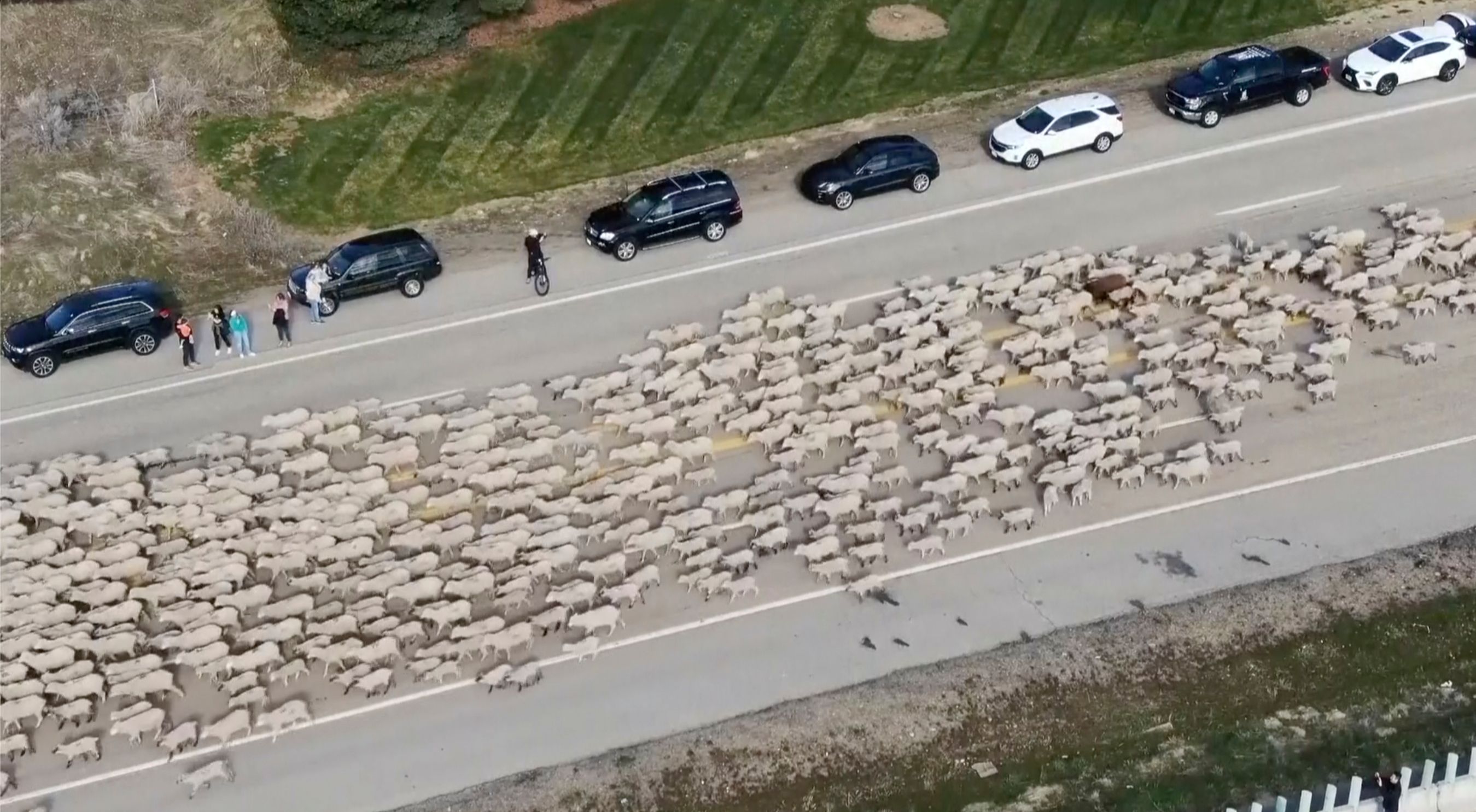 從畫面中可以看到,道路上完全不見任何車輛行駛的身影,反倒是數千隻的綿羊,在牧羊人引導之下,浩浩蕩蕩地在公路上演繹著何謂「逐水草而居」。