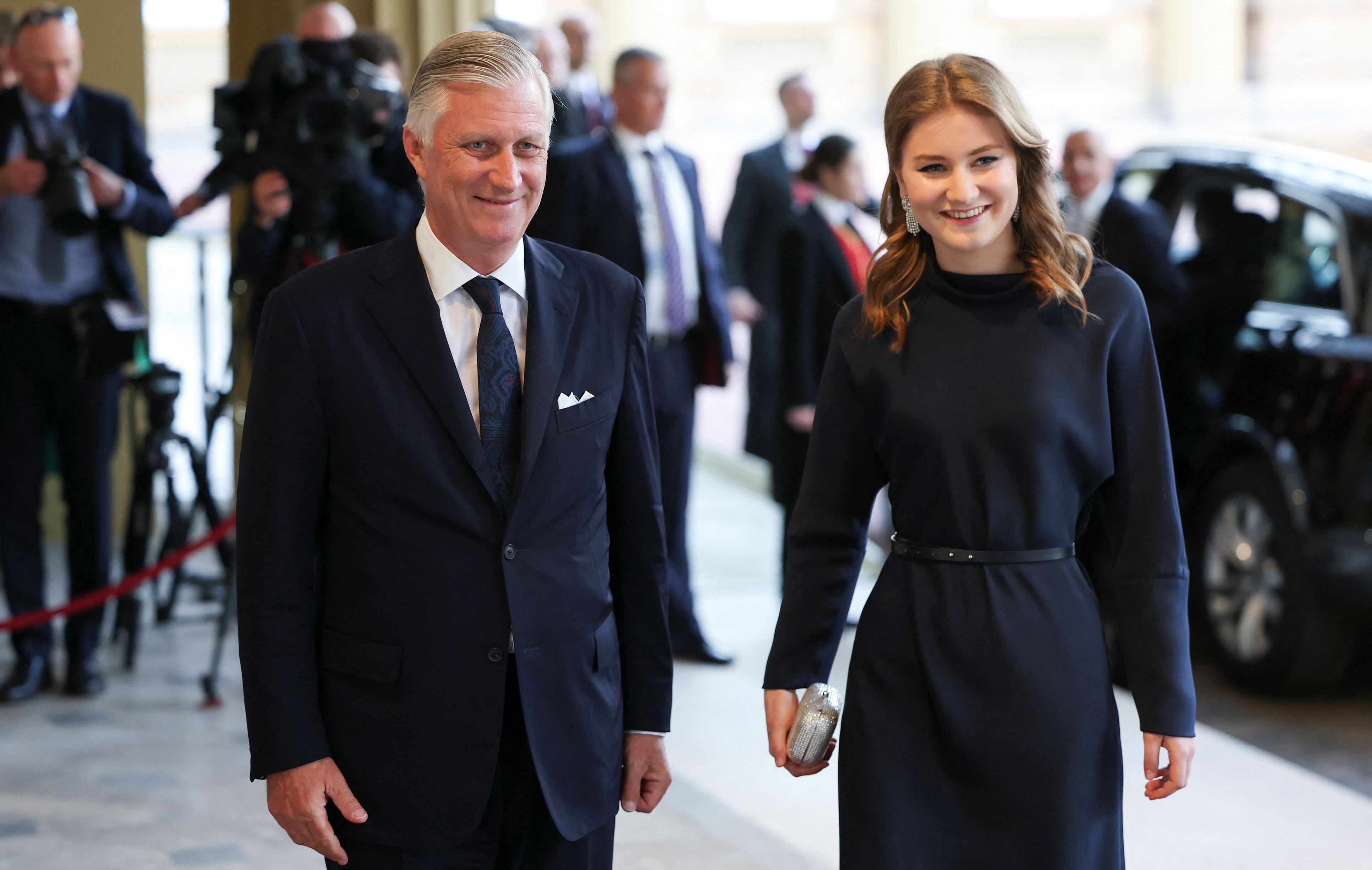 未來將成為比利時王室第一位女王的伊莉莎白公主(Princess Elisabeth),21歲的她目前正在英國牛津大學學習歷史和政治,她在父親菲利普國王(Philippe Léopold Louis Marie)陪同下,一起出席晚宴,伊莉莎白穿著價值約新台幣14.3萬的亞曼尼(Giorgio Armani)海軍藍連身裙,腰上繫著黑色皮帶、穿著黑色高跟鞋,並以耀眼的鑽石垂墜耳環、銀色手拿包增添奢華氣息。