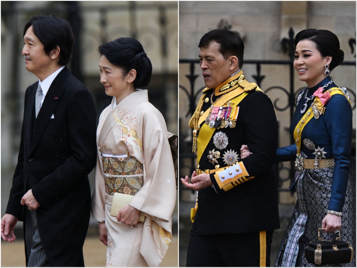 泰國國王瓦吉拉隆功(King Maha Vajiralongkorn)與王后蘇堤達(Suthida)一同前往西敏寺觀禮,夫婦倆穿上顏色沉穩的黑色、孔雀藍的傳統服裝,其中蘇堤達選穿長袍,在搭配各式寶石首飾、特色的手提箱包、銀色高跟鞋,一身行頭顯得貴氣又時尚。