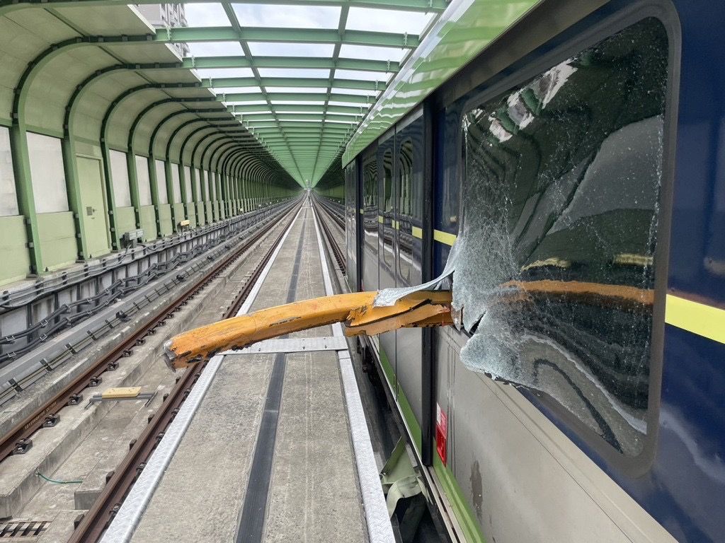 從照片畫面中清晰可見,車廂的玻璃窗和內部座椅,遭鐵架撞擊後散落地面、車廂壁上的廣告也掉落在地上,現場一片狼藉。台中捷運也緊急發出訊息通知,捷運市政府站到九張犁站停駛,提醒乘客多加注意。