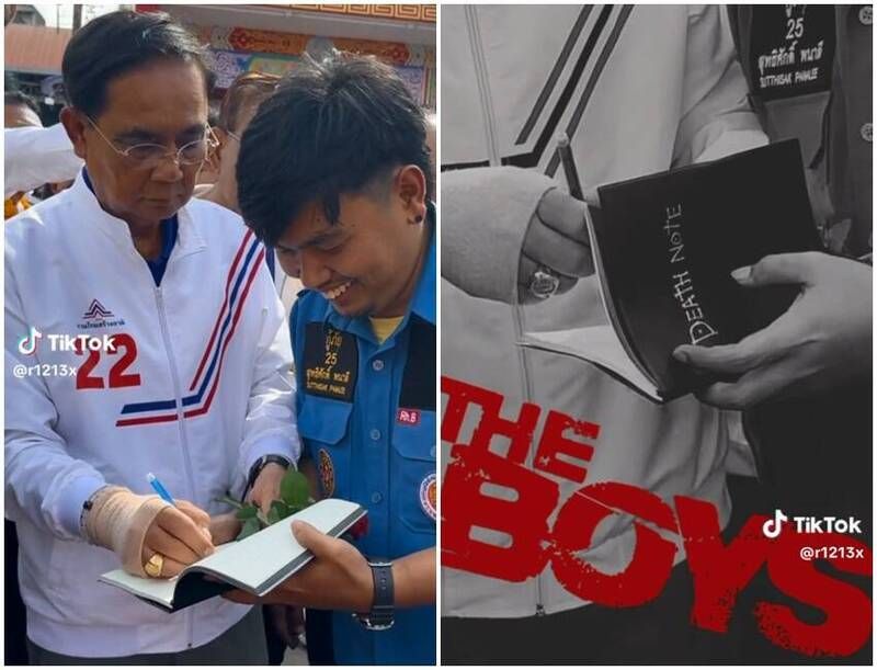 泰國國會大選即將在5月14日登場,在位已超過8年的69歲總理帕拉育(Prayut Chan-o-cha)也投入連任競選,他日前出席造勢活動卻被惡整,一名「支持者」跑到他面前要簽名,然而讓帕拉育簽的卻是「死亡筆記本」,這段影片在短影音平台TikTok瘋傳,累計超過160萬次觀看。