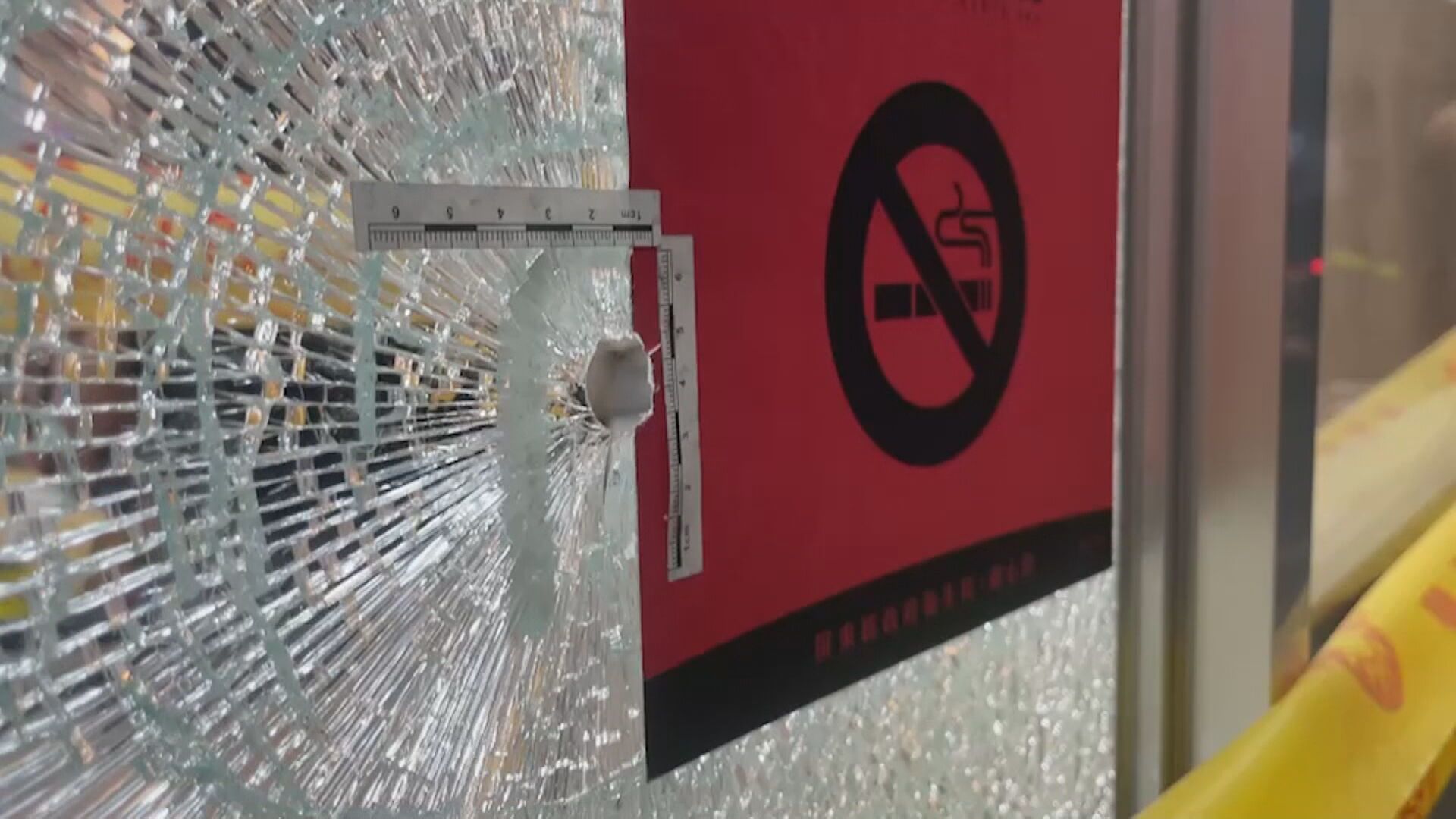 另一目擊民眾v.s.記者:「彈孔在這裡,這個彈孔,流彈打到,波及到了。」屏東分局偵查隊長葉憲威:「本分局員警於19時30分許,在屏東市基督教醫院旁,為圍捕涉嫌槍砲案枝林姓犯嫌,林姓犯嫌拒捕且衝撞警方偵防車,因此本分局員警大膽使用槍械,目前已將涉案車輛查扣,並持續追緝犯嫌中。」而在圍捕過程中,犯嫌還從車內丟出一把瓦斯槍, 警方封鎖現場採證,目前正在追捕嫌犯。