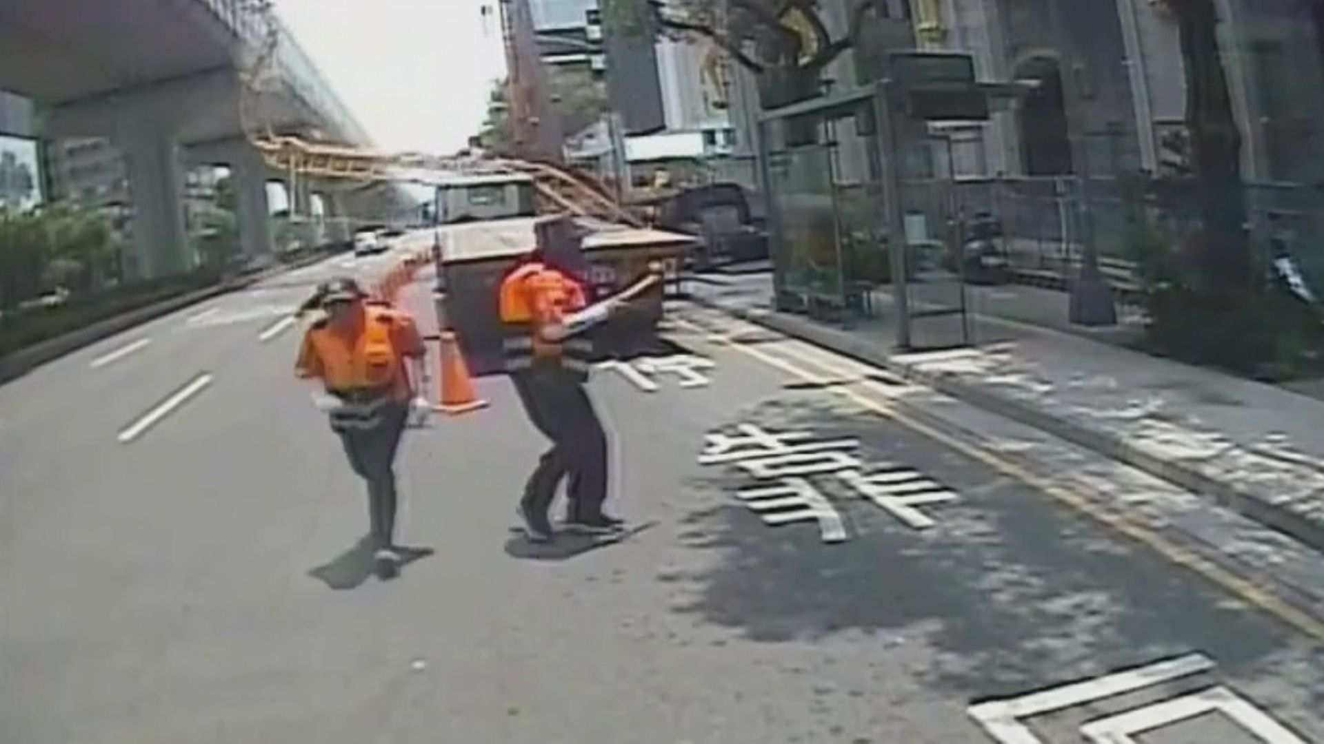 畫面上可以看到, 當時地面有3名人員,正在維持交通,有兩人在聊天,其中一人聽到上方有聲響,正是吊臂落下,撞到建築物牆面的瞬間,工人抬頭一看,發現這龐然大物,趕緊喊著同伴拔腿就跑,這生死之間,只差2秒, 所幸都沒有受傷。