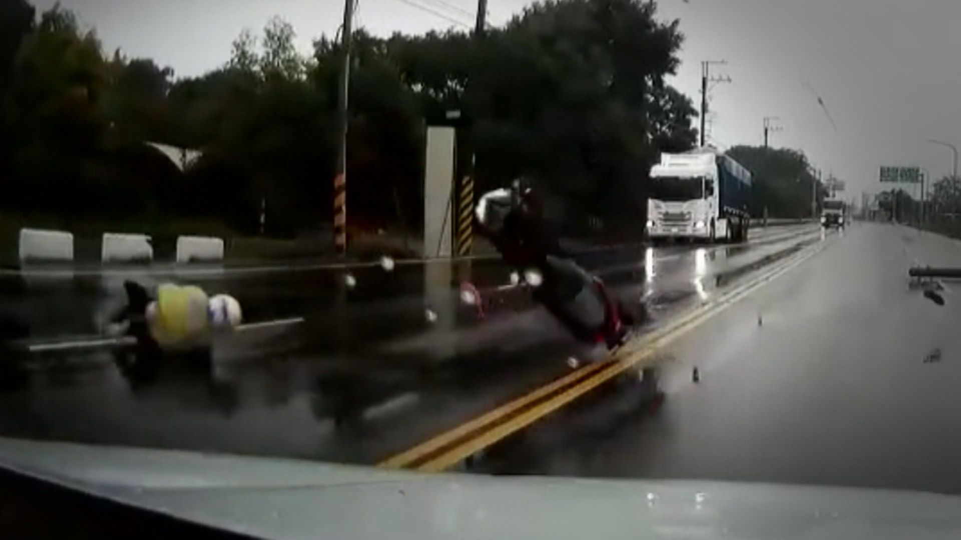 民眾的行車紀錄器清楚拍下,昨(19日)傍晚5點左右,行經「台19線」鹽水路段時,看見前方有機車騎士突然停住,仔細看原來是有一根電線桿橫躺在車道上。沒想到下一秒,對向車道另一名機車騎士疑似視線不良,遭到電線桿的電線絆倒,連人帶車往前摔,騎士在空中翻了一圈才墜落地面,當場嚇壞經過的用路人,趕緊幫忙叫救護車,將受傷騎士緊急送醫。