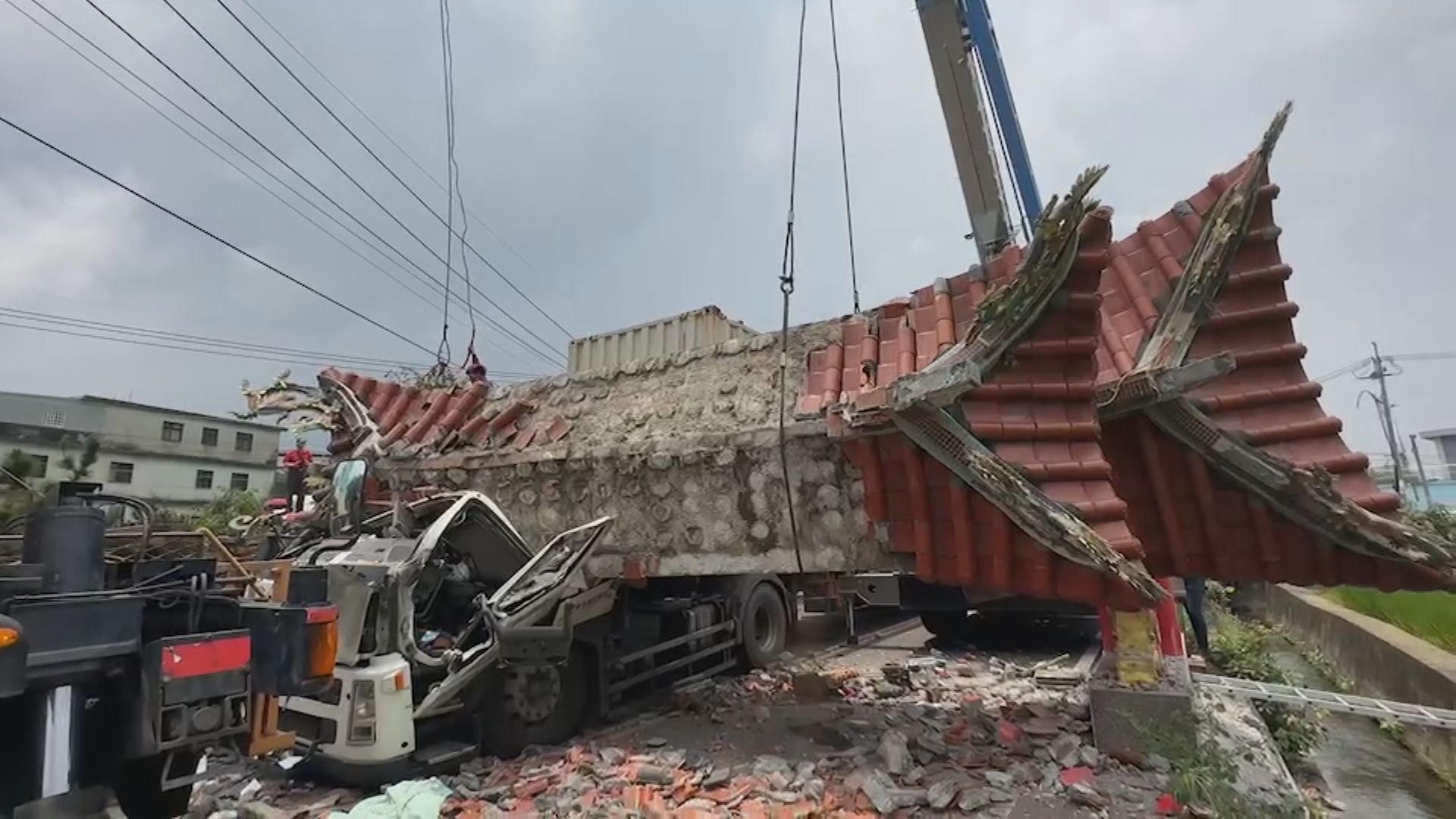聯結車的車頭,毀損變形的相當嚴重,也因為牌樓倒塌時,並非完全斷裂,裡面的鋼筋還連著,所以施救時,消防人員擔心用吊車吊,牌樓會掉下來,造成人員更多的風險,因此再加派一輛卡車,從後面拖把聯結車先拖離開危險地區,再進行救援,總共出動了三輛吊車和一輛卡車。
