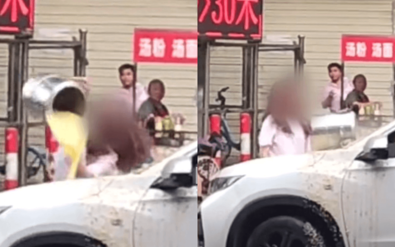 綜合陸媒報導,位於中國大陸廣東省東莞市在5月20日發生一起砸車事件,一名年輕女子當街逼停一輛白色轎車,先是抄起傢伙砸碎擋風玻璃和後照鏡,隨後又扛起路邊早餐店的3大桶熱粥潑向白色轎車,嘴裡還不停地飆罵「渣男」,有趣的是,被潑粥的男車主竟站在一旁默不作聲,不敢上前阻止。