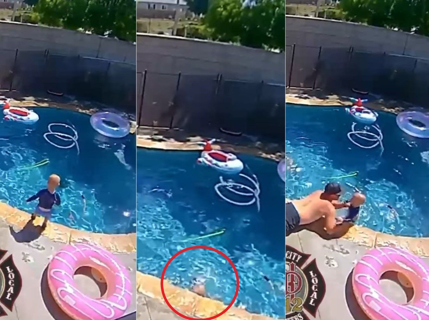 綜合外媒報導,男子佩提特(Zachary Petite)在南加州赫米特(Hemet)消防局擔任消防工程師與救護人員,16日他在自家的游泳池陪兒女玩水,卻發生一起驚險事件,監視器拍下,1歲兒子柯爾(Cole)趁大人不注意,先將身上的手臂浮力圈脫下走到泳池邊,接著坐下滑進水中。