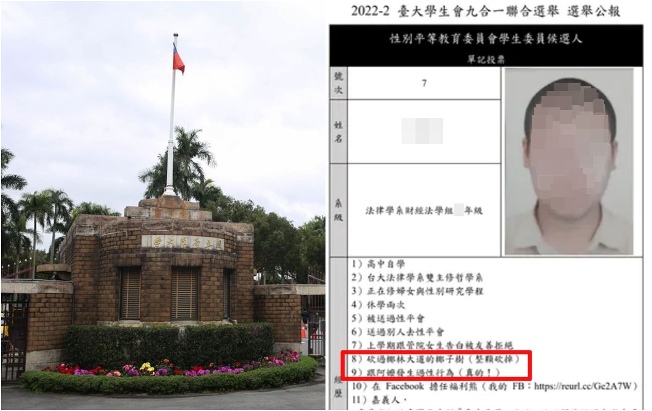 該名學生另外還列出被送過性平會、也送過別人去性平會,以及砍過椰林大道的椰子樹等詭異經歷,就連政見也天馬行空「改校名為『國立台灣性別平等大學』」、「每週寄郵件給全校師生『你今天有被性騷擾嗎?』」等,揶揄意味強烈。