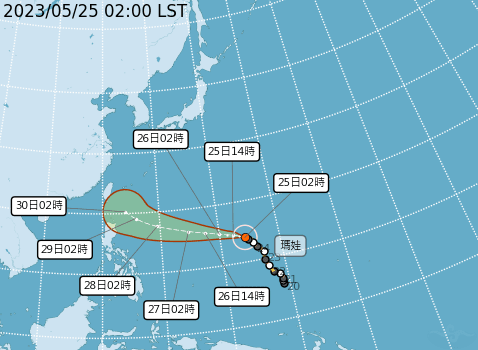 今年第2號颱風瑪娃,在昨天(24日)清晨2時的中心位置在鵝鑾鼻東南東方2,650公里的海面上,未來以北北西轉西北西方向前進,會先接近菲律賓東方海面,接著北轉朝日本移動,由於距離尚遙遠,短期內對台灣天氣無直接影響,後期路徑不確定性較大。