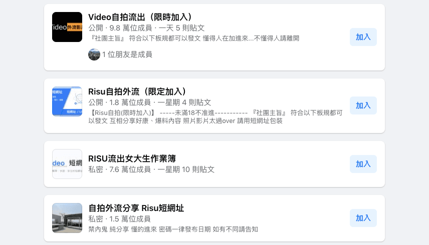 一到社群打入關鍵字「RISU」,就會出現大量「自拍外流」、「未滿18不准進」等社團,社內人數從幾千到破10萬人次都有,數量龐大,引起社會譁然,因為社團透過RISU(短網址),來規避社群審查機制,上傳大量不法偷拍、未經當事人同意的私密照、影片等,意外也引發「噁心試紙」運動,若有朋友加入這類社團,都容易被貼上標籤,不過也傳出有用戶在臉書搜尋相關貼文被莫名自動加入社團的案例。