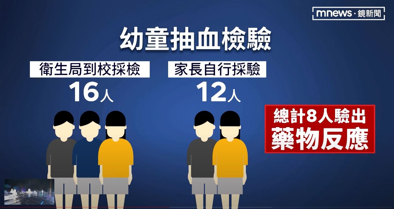 幼兒園共67名學童,有28名採檢,其中12名是家長自行採檢,另外16名則是配合專案採檢,目前8名學童驗出「巴比妥」等管制藥物成分,其中1人明顯超標,數值達200以上,不過該孩童家中有人服用巴比妥成分的醫師處方藥,有可能是家人間交叉汙染;其餘7人濃度都在20以下,研判有可能是自然環境的接觸導致。