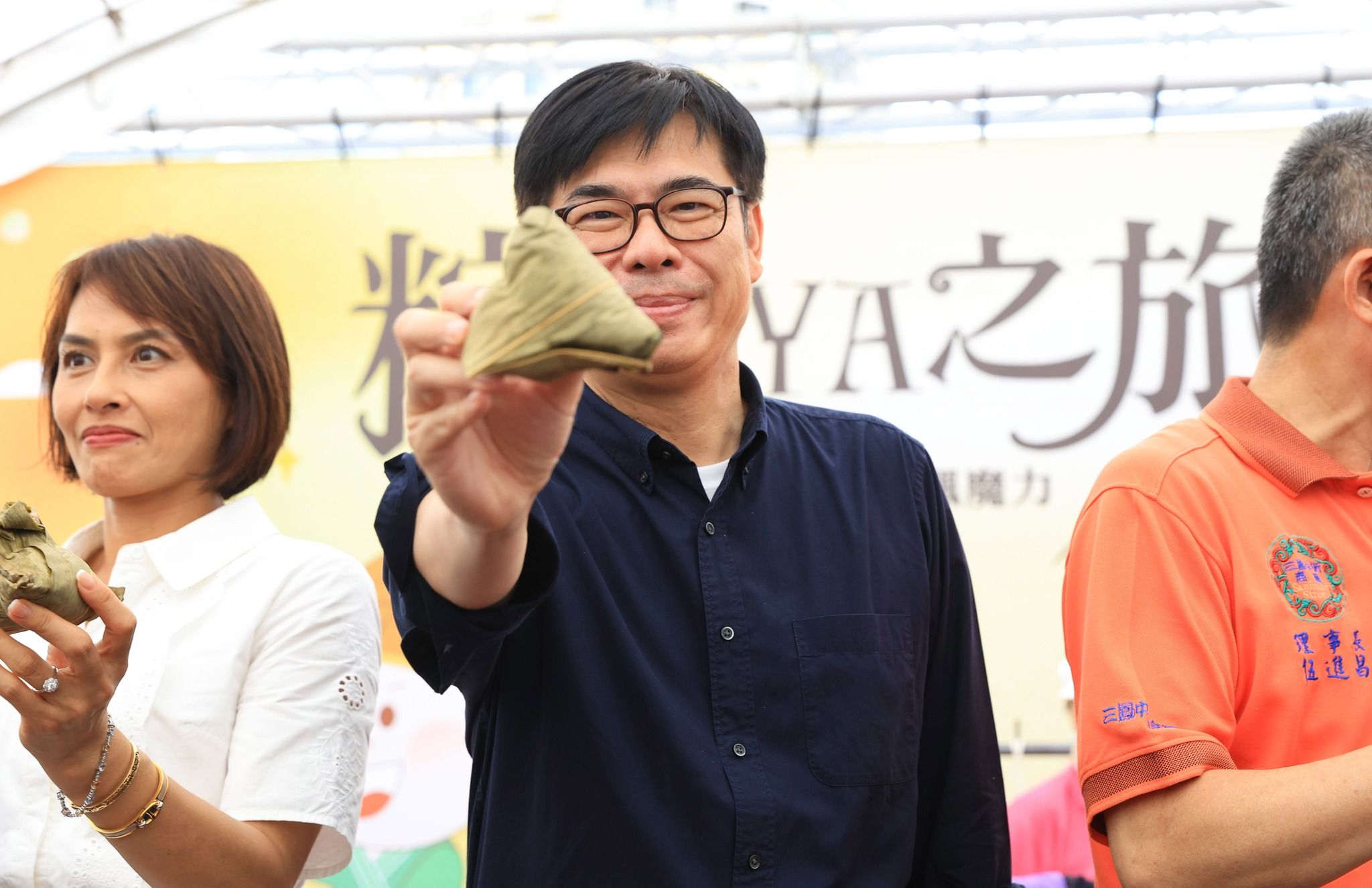 陳其邁更鳴起「肉粽南北戰爭」第一槍,現場直接向台北市長蔣萬安叫陣,表示南部粽好吃到無法言喻,「蔣萬安要注意看,高雄包的粽子絕對比台北的好吃」,更說「北部粽充其量只是3D油飯」,南部粽的作法才有正港的粽子味。