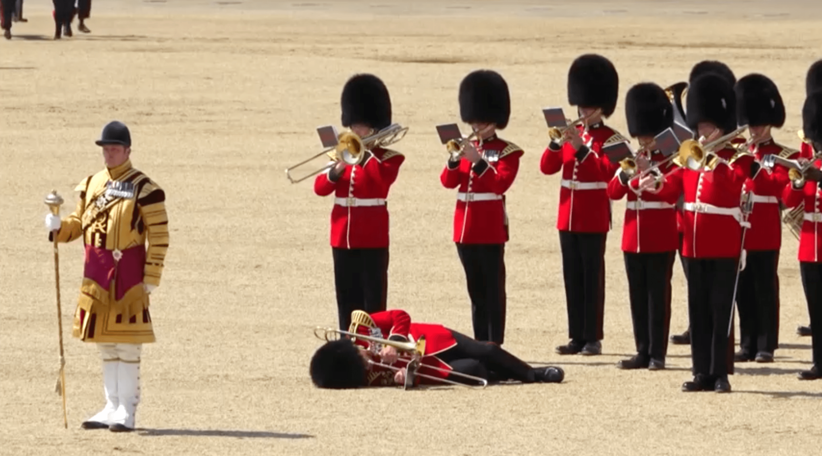 不過由於10日英國的氣溫直達30度高溫,創下英國今年來的最高溫,而士兵們穿著長袖軍裝加上碩大的帽子,在彩排過程中,有3人因中暑倒地,其中一名長號手在倒地後仍不忘自己的任務,還敬業地繼續吹奏手中的樂器,讓人看了十分佩服,這名士兵隨後也被攙扶出場。