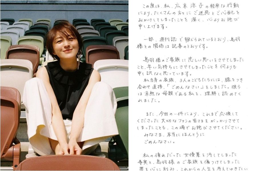 廣末涼子14日上午在IG發表聲明,坦言確實和米其林名廚鳥羽周作發生婚外情,並表示已和家人道歉,「因為輕率的行為,對許多人造成困擾和擔憂,對此我深感抱歉,發自內心誠摯道歉。」